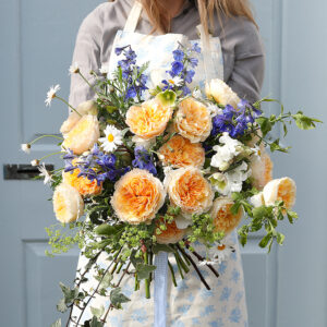 David Austin Beatrice is a rose brimming with sunshine, her bold, buttery-yellow heart surrounded by ruffled petals in golden swirls. As she opens, her blooms soften into shapely rosettes of blonde and vanilla tones, creating a luminous display. With a strong, complex fragrance of myrrh touched with fruit and almond, Beatrice carries both richness and charm, a rose that evokes the joy and warmth of a golden summer gathering.