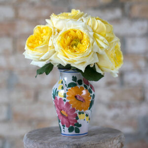 Toulouse Lautrec is a garden rose of radiant charm, her buds glowing in fresh spring yellow before opening into heavily petalled rosettes with a romantic, quartered heart. Each bloom carries between 60 and 90 petals, creating a lush and timeless form. With her strong, sweet fragrance of lemon verbena, she evokes memories of classic rose gardens and fills every arrangement with warmth and nostalgia.